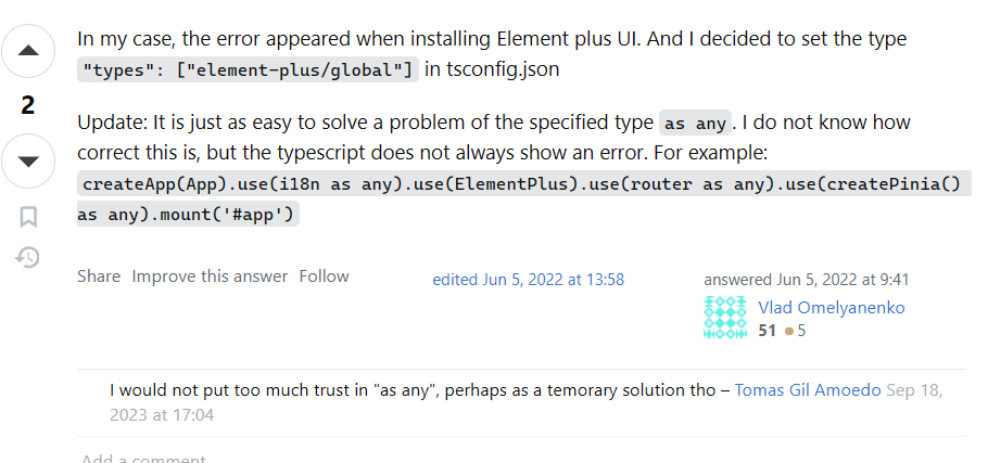 vue ts router를 쓰다가 이 오류를 만남. '{ 라우터: 라우터; 유형의 인수 }'는 'Plugin' 유형의 매개변수에 할당할 수 없습니다. app.use(router as any);이거 쓰면 오류는 사라지는데..왜 사라지느냐? any는 TS의 탈출구문으로 타입 시스템의 제한을 벗어나고 싶을때 any 를 사용할 수 있다.any를 사용하면 타입의 안정성을 희생하는 대신 코드를 원래 JS에 더욱 가깝게 작성할 수 있다.any는 어떤 타입이든 다른 타입에 할당할 수 있도록 만드는 '타입 와일드카드'와 같다.라고 한다.( 참고 : https://velog.io/@daily_d/TypeScript-%ED%83%80%EC%9E%85-%EC%98%A4%EB%A5%98 ) 이런 것도 있었는데..아래는 비슷한 ..
